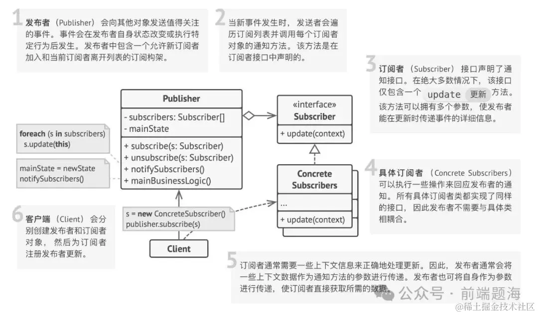 观察者模式允许任何实现了订阅者接口的对象订阅发布者对象的事件通知。 你可在按钮中添加订阅机制, 允许客户端通过自定义订阅类注入自定义代码。