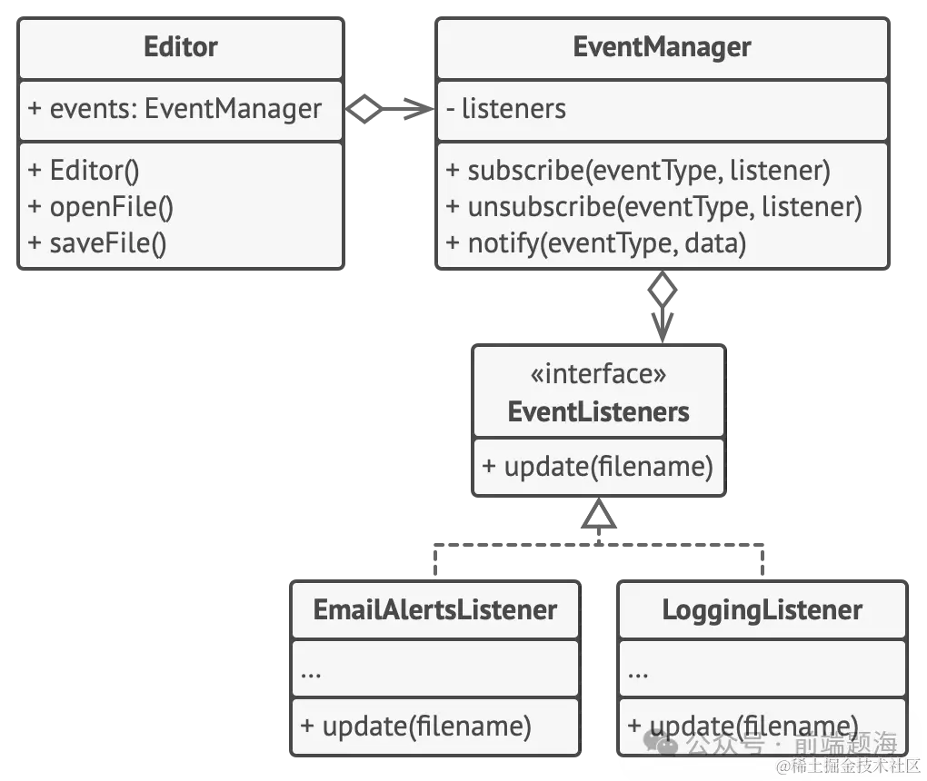 // 发布者基类包含订阅管理代码和通知方法。class EventManager is private field listeners: hash map of event types and listeners method subscribe(eventType, listener) is listeners.add(eventType, listener) method unsubscribe(eventType, listener) is listeners.remove(eventType, listener) method notify(eventType, data) is foreach (listener in listeners.of(eventType)) do listener.update(data)// 具体发布者包含一些订阅者感兴趣的实际业务逻辑。我们可以从发布者基类中扩// 展出该类,但在实际情况下并不总能做到,因为具体发布者可能已经是子类了。// 在这种情况下,你可用组合来修补订阅逻辑,就像我们在这里做的一样。class Editor is public field events: EventManager private field file: File constructor Editor() is events = new EventManager() // 业务逻辑的方法可将变化通知给订阅者。 method openFile(path) is this.file = new File(path) events.notify("open", file.name) method saveFile() is file.write() events.notify("save", file.name) // ……// 这里是订阅者接口。如果你的编程语言支持函数类型,则可用一组函数来代替整// 个订阅者的层次结构。interface EventListener is method update(filename)// 具体订阅者会对其注册的发布者所发出的更新消息做出响应。class LoggingListener implements EventListener is private field log: File private field message: string constructor LoggingListener(log_filename, message) is this.log = new File(log_filename) this.message = message method update(filename) is log.write(replace('%s',filename,message))class EmailAlertsListener implements EventListener is private field email: string private field message: string constructor EmailAlertsListener(email, message) is this.email = email this.message = message method update(filename) is system.email(email, replace('%s',filename,message))// 应用程序可在运行时配置发布者和订阅者。class Application is method config() is editor = new Editor() logger = new LoggingListener( "/path/to/log.txt", "有人打开了文件:%s"); editor.events.subscribe("open", logger) emailAlerts = new EmailAlertsListener( "admin@example.com", "有人更改了文件:%s") editor.events.subscribe("save", emailAlerts)
