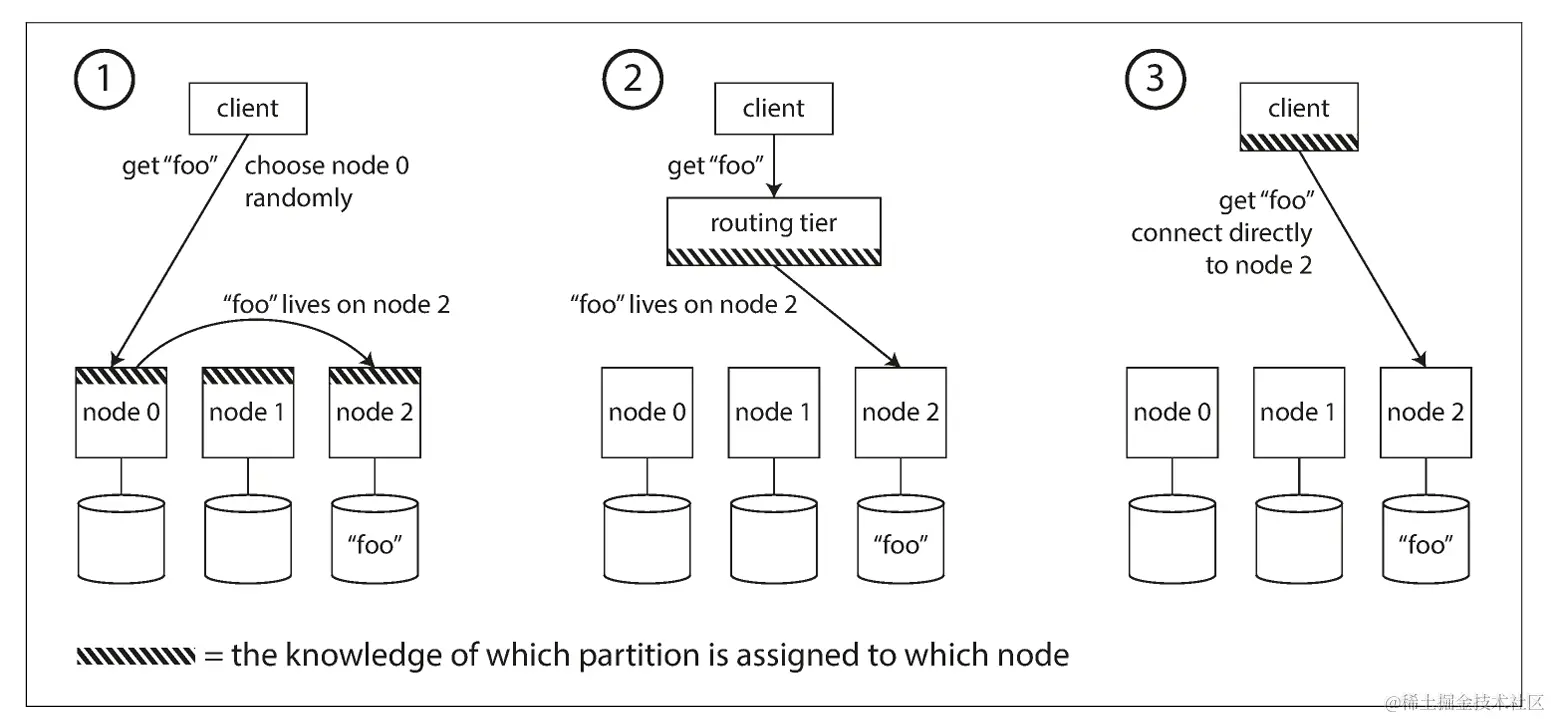 完成数据分区后,还需要处理将客户端请求重定向至存储所需数据的节点上的路由问题。请求路由问题属于一种典型的服务发现问题,服务发现并不局限于数据库,任何需要通过网络访问的系统都有类似的需求,大概有如下几种策略: