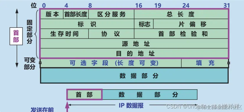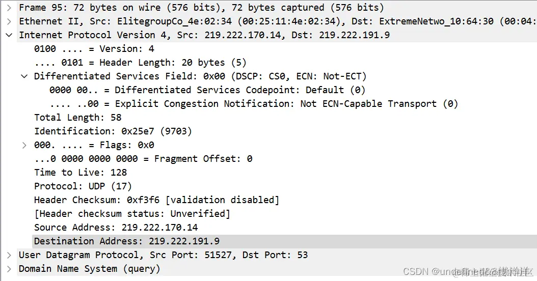 - 首部检验和(16 bit)字段检验数据报的首部,当前值是947a(H);