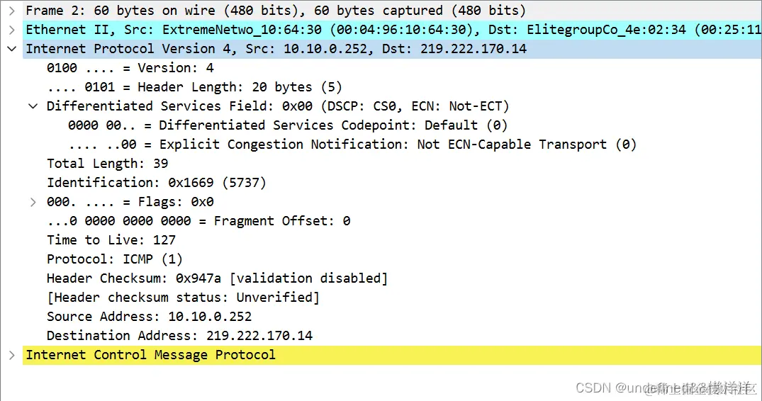 - 总长度——占 16 bit,指首部和数据之和的长度,00 27(H)=39 字节(39byte)。