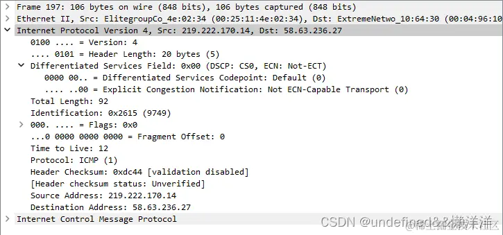 - 标识(identification) 占 16 bit,它是一个计数器,用来产生数据报的标识,便于重装分片的同一数据报,当前值为25 bf (H)=9663;