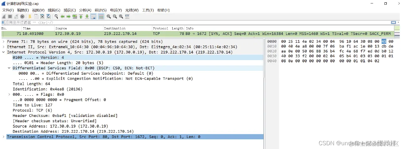 | 实验步骤 | 1、ARP 地址解析协议数据打开文件“计算机网络实验”,这是一个网络通信记录,详细记录了分组的序号、相对时间、源地址、目标地址、协议类型、内容,第26 个分组为例,可以发现该MAC 帧目标address 是ff:ff:ff:ff:ff:ff,是一个广播帧(broadcast),源地址是00 25 11 4e 02 34 ,帧类型是地址解析协议ARP(0806),本机查询网关的物理地址。第27 个分组是网关给出了其物理地址发给本地主机,数据字段的长度小于 46 字节,在数据字段的后面发送方加入整数字节的填充字段Trailer,以保证以太网的 MAC 帧长不小于 64 字节(含FCS)。(注意:最下栏左面的序号为16 进制,如0010 是16 十进制),填充内容一般常见是连续的0。2、IP 数据包的解析观察文件内第71 个分组的IP 数据包详细信息,见图2。- 它的前8 位是45(H)=0100 0101(B),其中0100(B)=4 ,表示IP 协议的版本是4; 0101(B)=5,表示首部长度是20 字节(一个单位为 4 字节,合计5 个单位)。 |