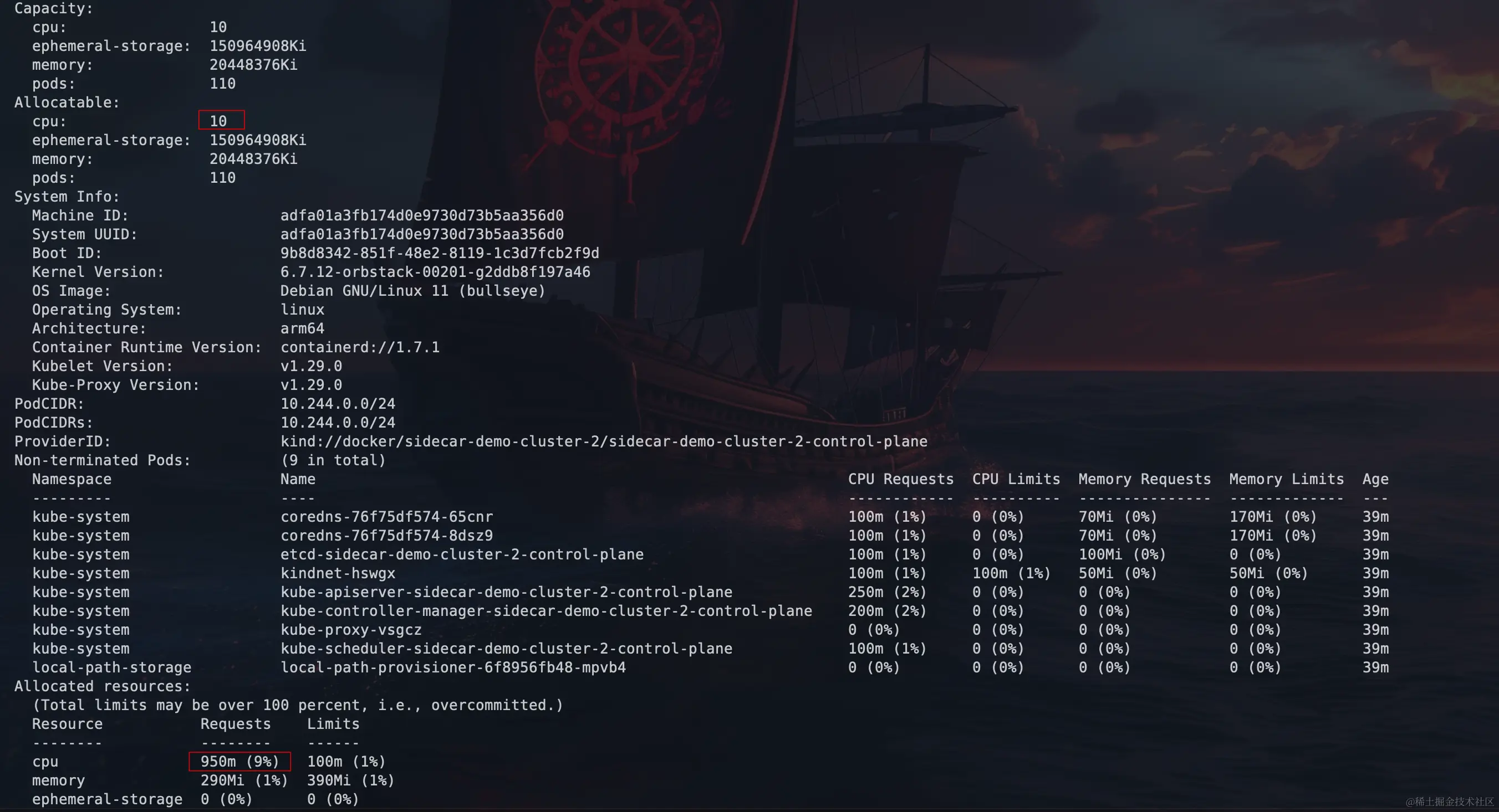 接下来我们用两个例子来验证上面的结论,当前 Kubernetes 集群中只有一个节点,使用 kubectl describe node 命令可以看到该节点总共有 10 个 CPU 可供分配,当前 CPU request 已经使用了 9% 的 CPU 资源,也就是说还有 9 个 完整的 CPU 可供分配。