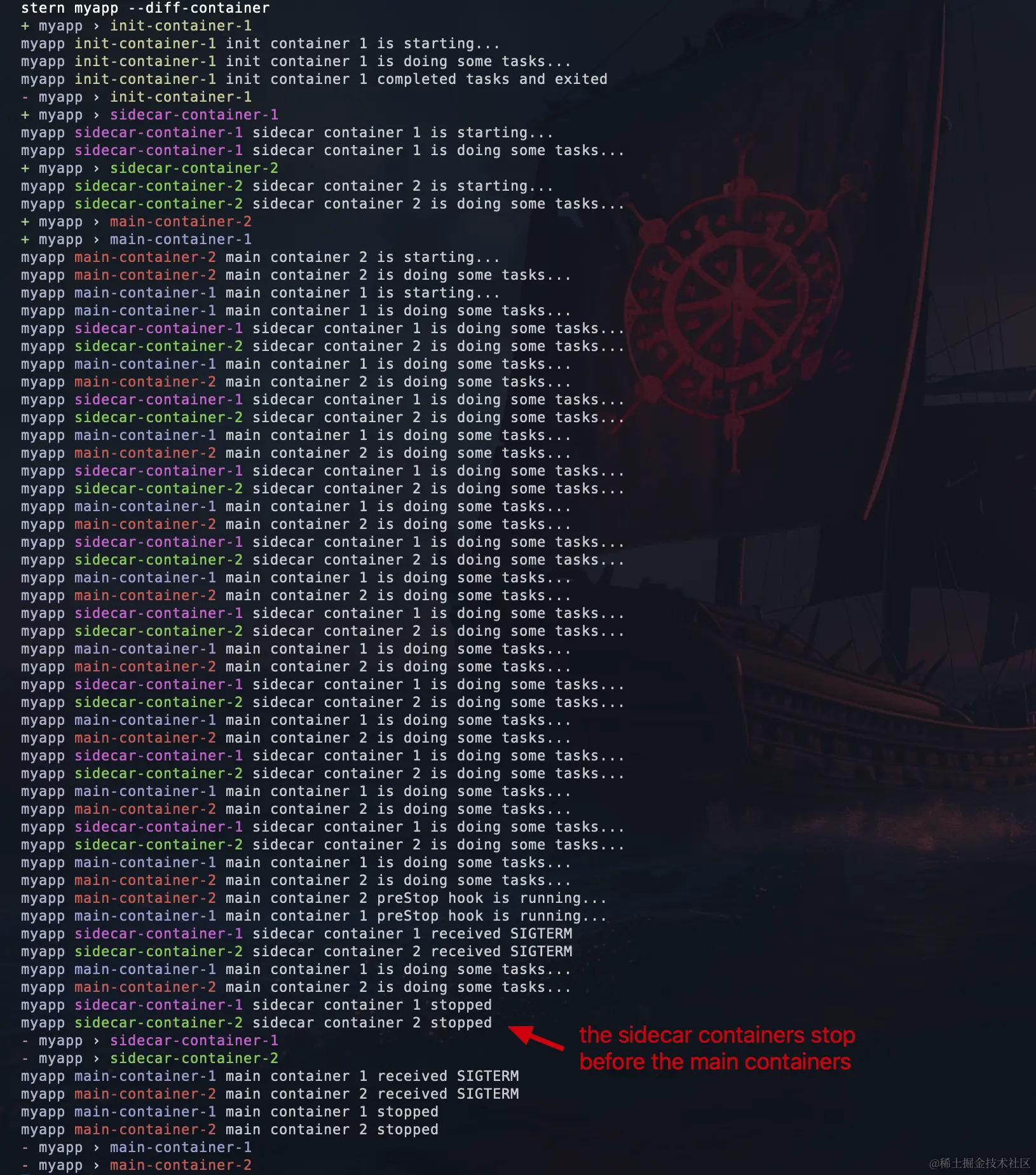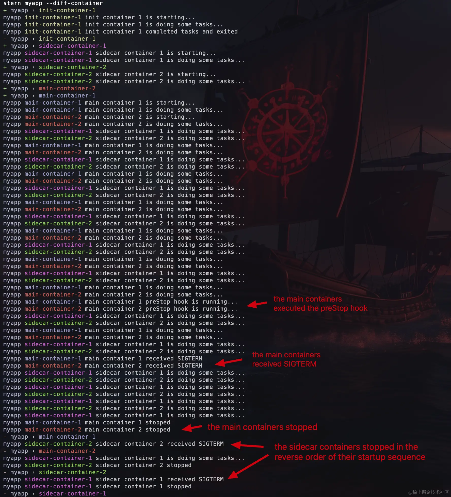 通过分析以下日志,我们可以清晰地看到容器退出的整个过程。首先两个主容器的 preStop hook 被执行,然后主容器接收到 Kubelet 发送的 SIGTERM 信号并正常退出。等到主容器完全退出后,sidecar-container-1 才会接收到 SIGTERM 信号并正常退出。最后,sidecar-container-2 接收到 SIGTERM 信号并正常退出。