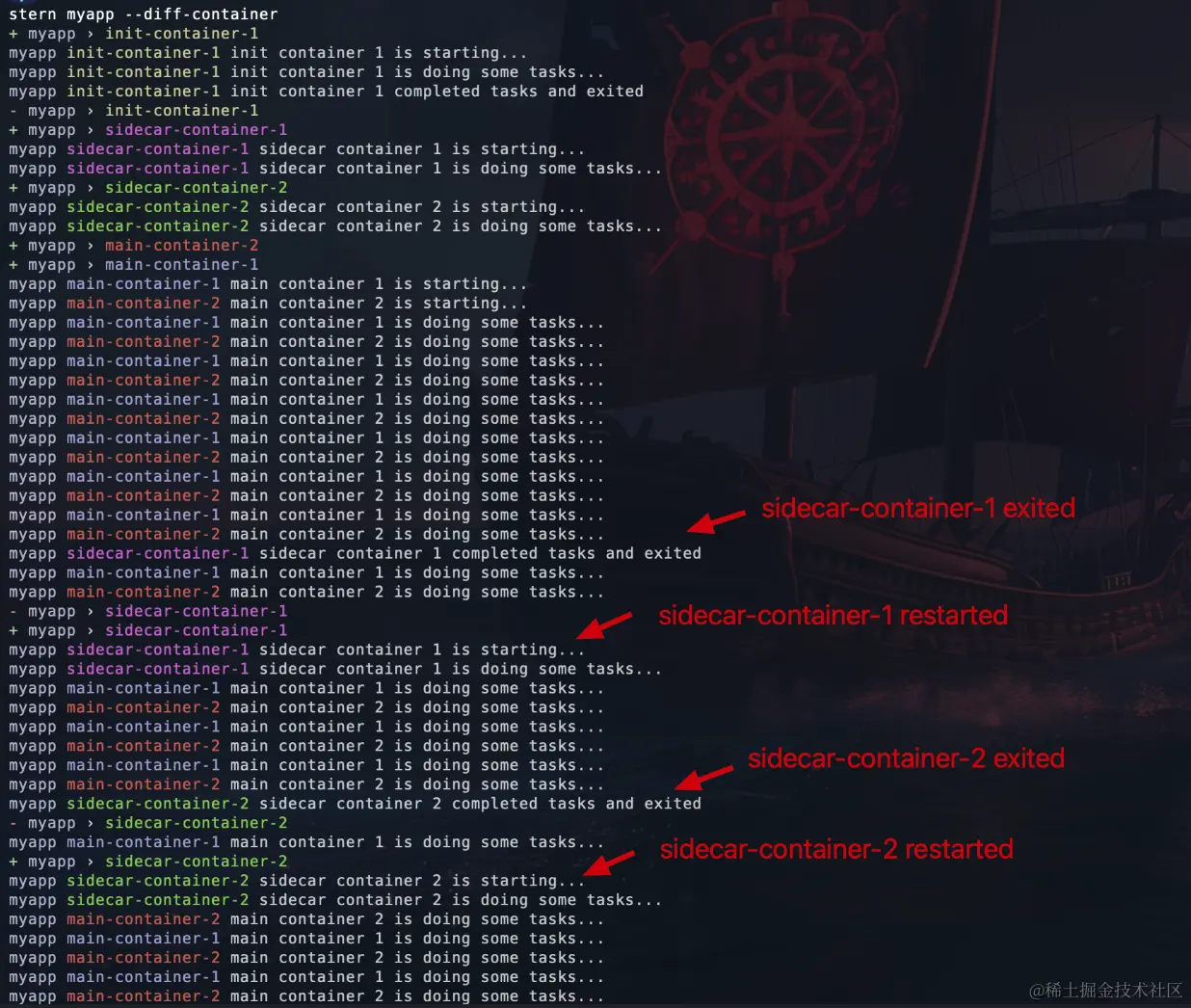 在本文的实验中,我们会在一个 Pod 中同时运行多个容器,为了方便观察日志,我们可以使用 stern 这个开源工具。 stern 允许我们同时查看多个 Pod 中多个容器的日志,并且以不同颜色进行显示,方便我们直观地进行区分。