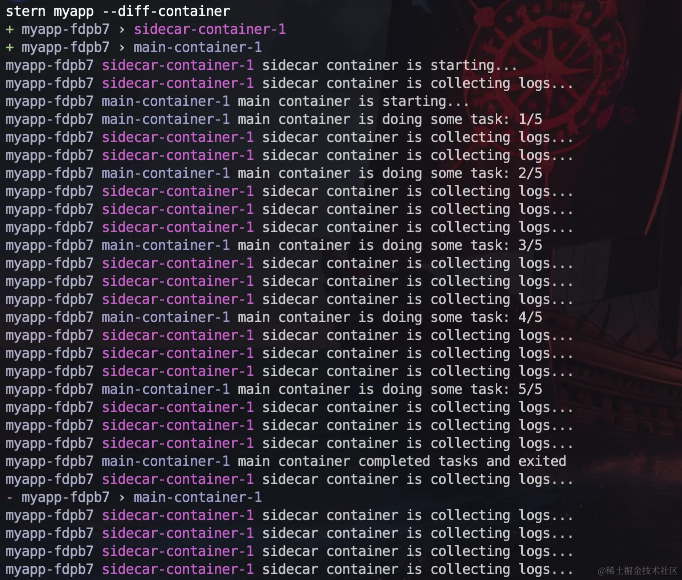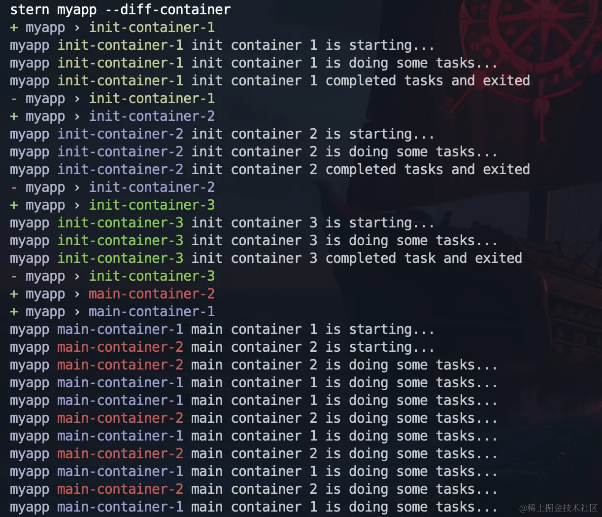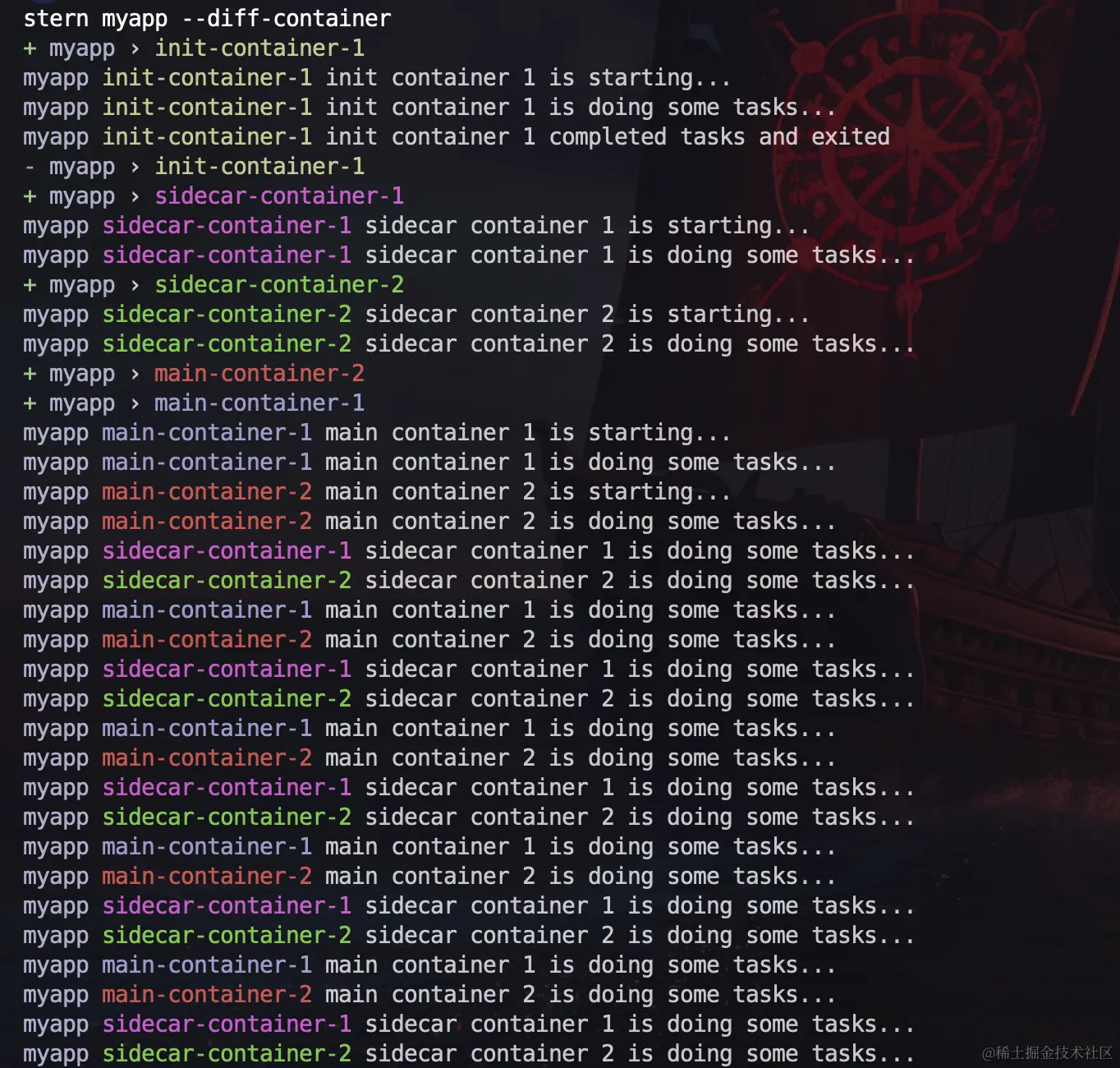 # --diff-container 参数会为每个容器的日志添加不同的颜色,默认情况下,只会为每个 Pod 的日志添加不同的颜色