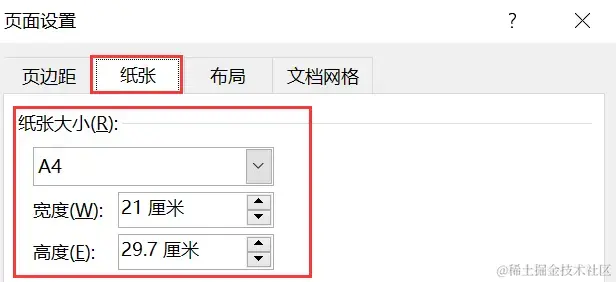步骤3:在 【纸张】 选项卡中,选择自定义纸张大小或调整纸张的方向(如横向或纵向),根据需要设置纸张的宽度和高度,使内容自然滚动到下一页,点击【确定】。