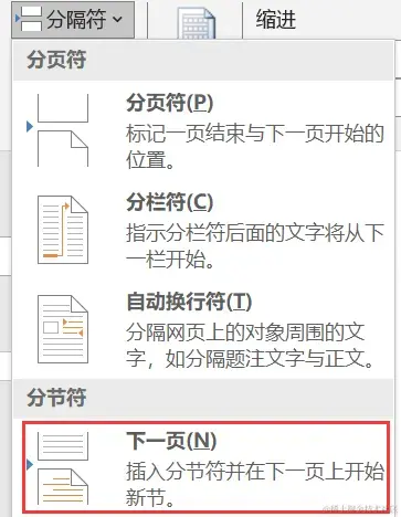 步骤4:选择 【分页符】或【下一页】,点击插入,此时,光标将自动跳转到新的一页。