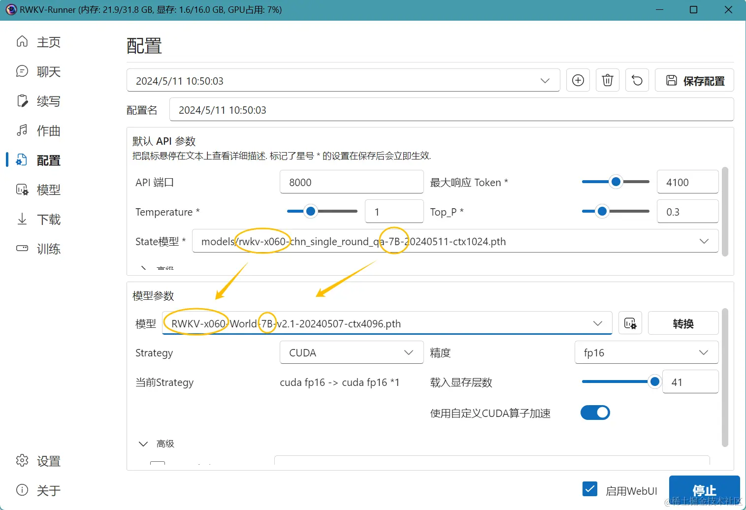 注意:挂载 state 文件时,必须使用训练该 state 文件的同款 RWKV 模型。