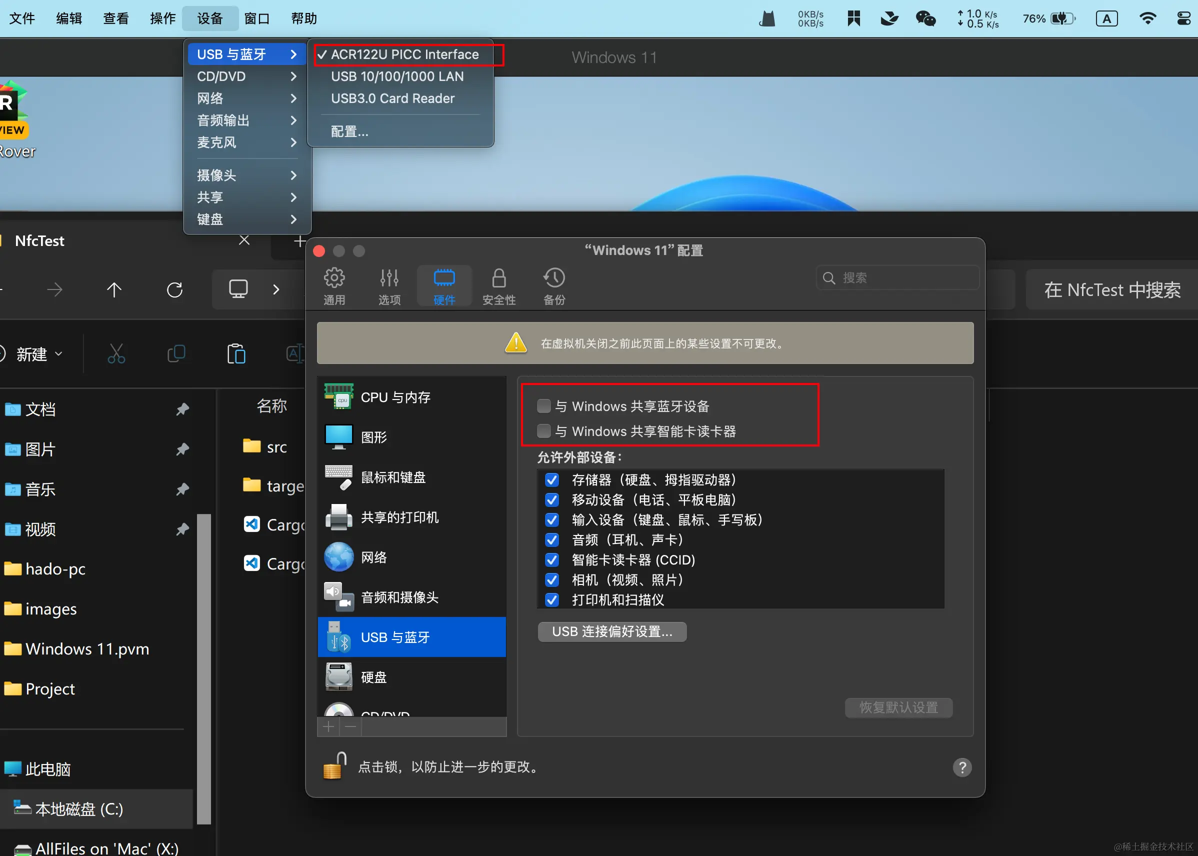 我用的parallels desktop虚拟机打开的windows系统,我用一个简单的工具测试了一下无法读到读卡器设备的结果,后来通过设置虚拟机设备 > 允许访问这个读卡器设备,才读到了nfc卡片内容