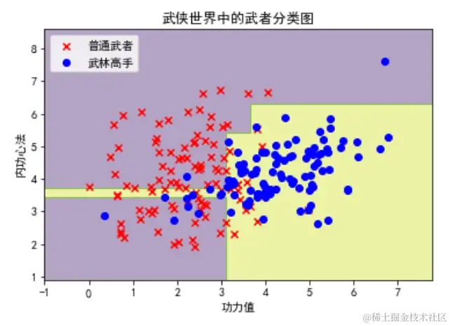 通过定义plot_decision_boundary函数,我们绘制了模型的决策边界,并使用不同颜色和形状标记来区分普通武者和武林高手,直观地展示了决策树在二分类任务中的分类效果。