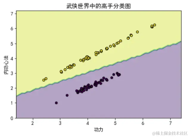 这段代码首先生成了一组包含200个样本的武侠风格数据,每个样本有两个特征:功力值和内功心法,目标是分类武者是否为武林高手。