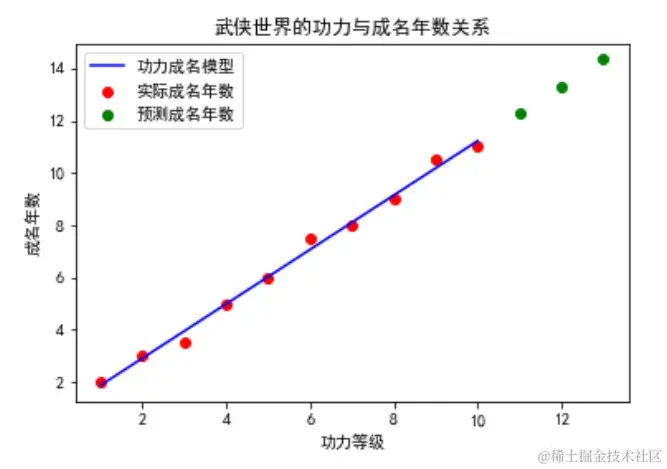 最后,通过绘图展示了功力等级与成名年数之间的线性关系,以及模型的预测效果。