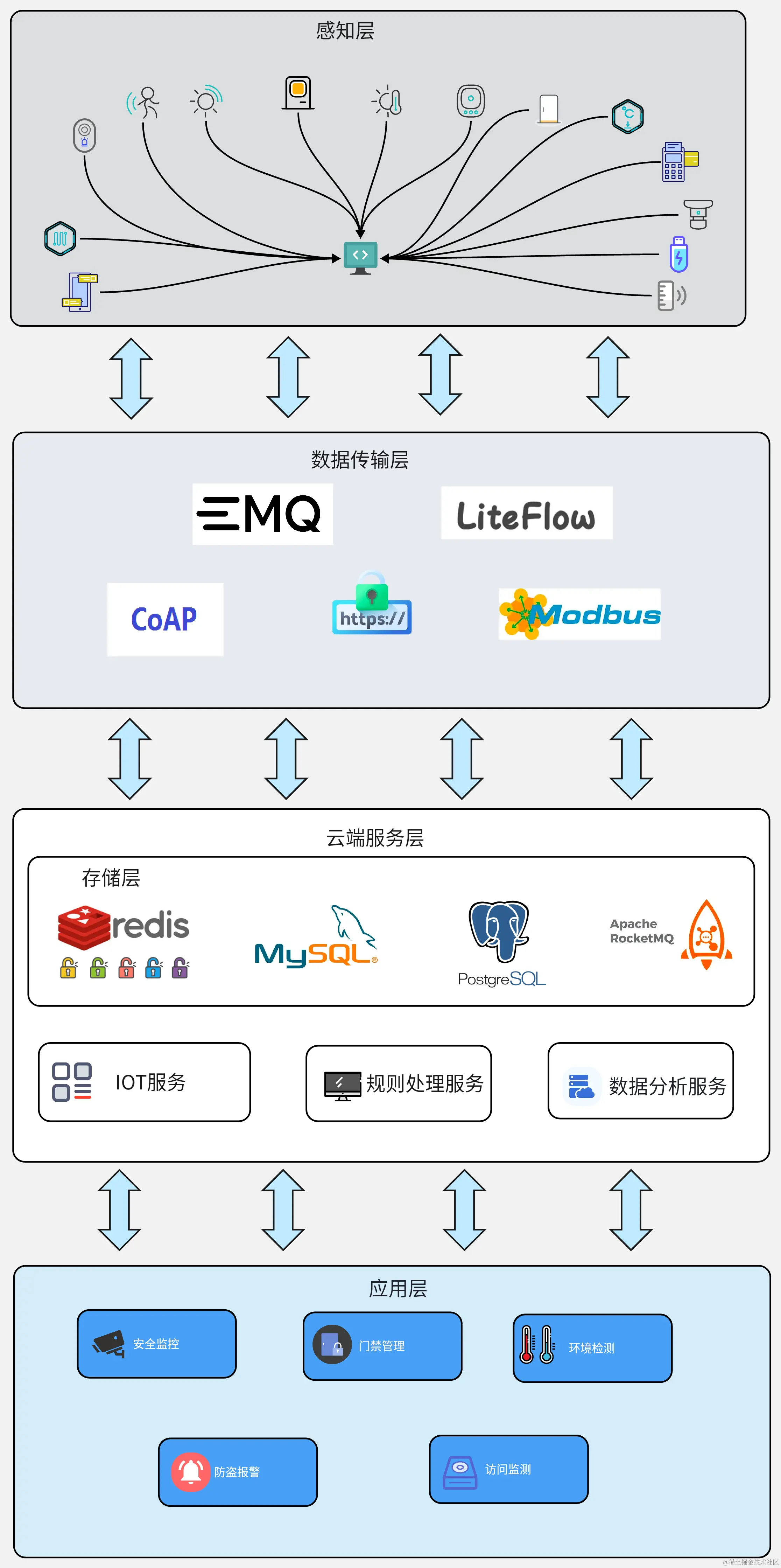 - 感知层:主要包括门禁、人脸识别设备、温度、水浸、电压等感知设备。这些设备可以通过局域网或者无线网络等方式连接到云端服务器,将采集到的数据传输到云端。