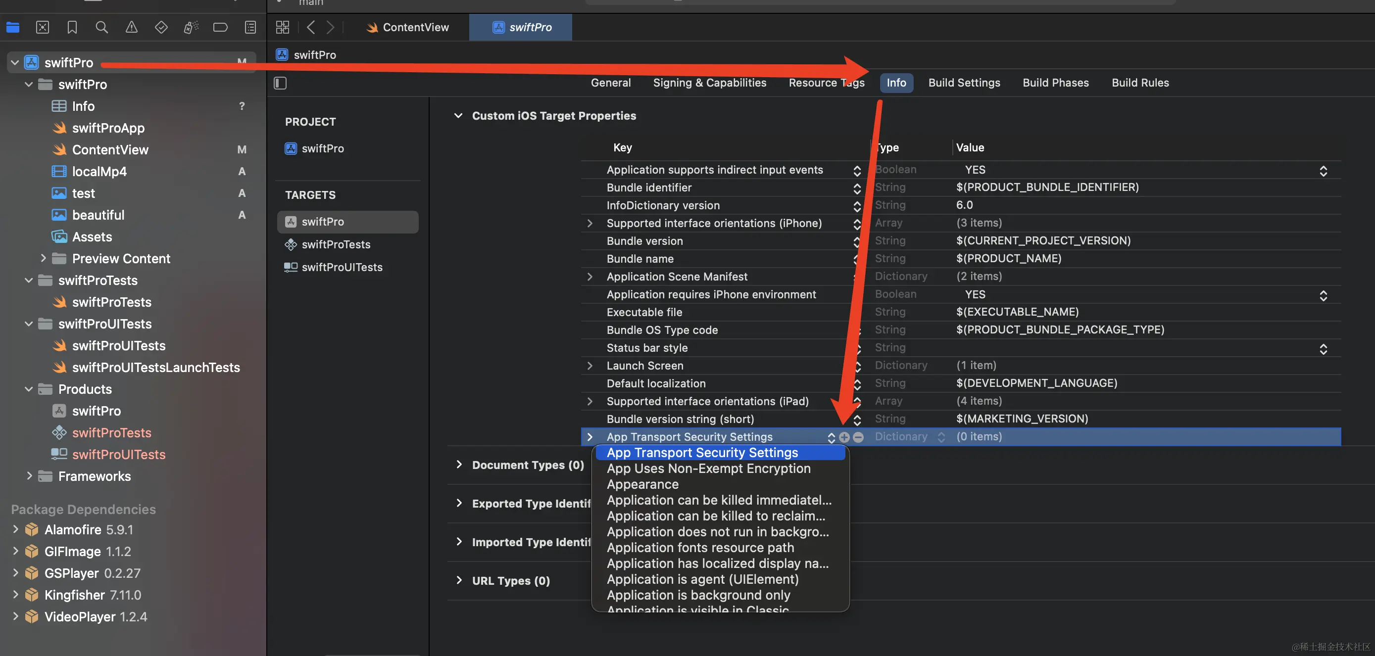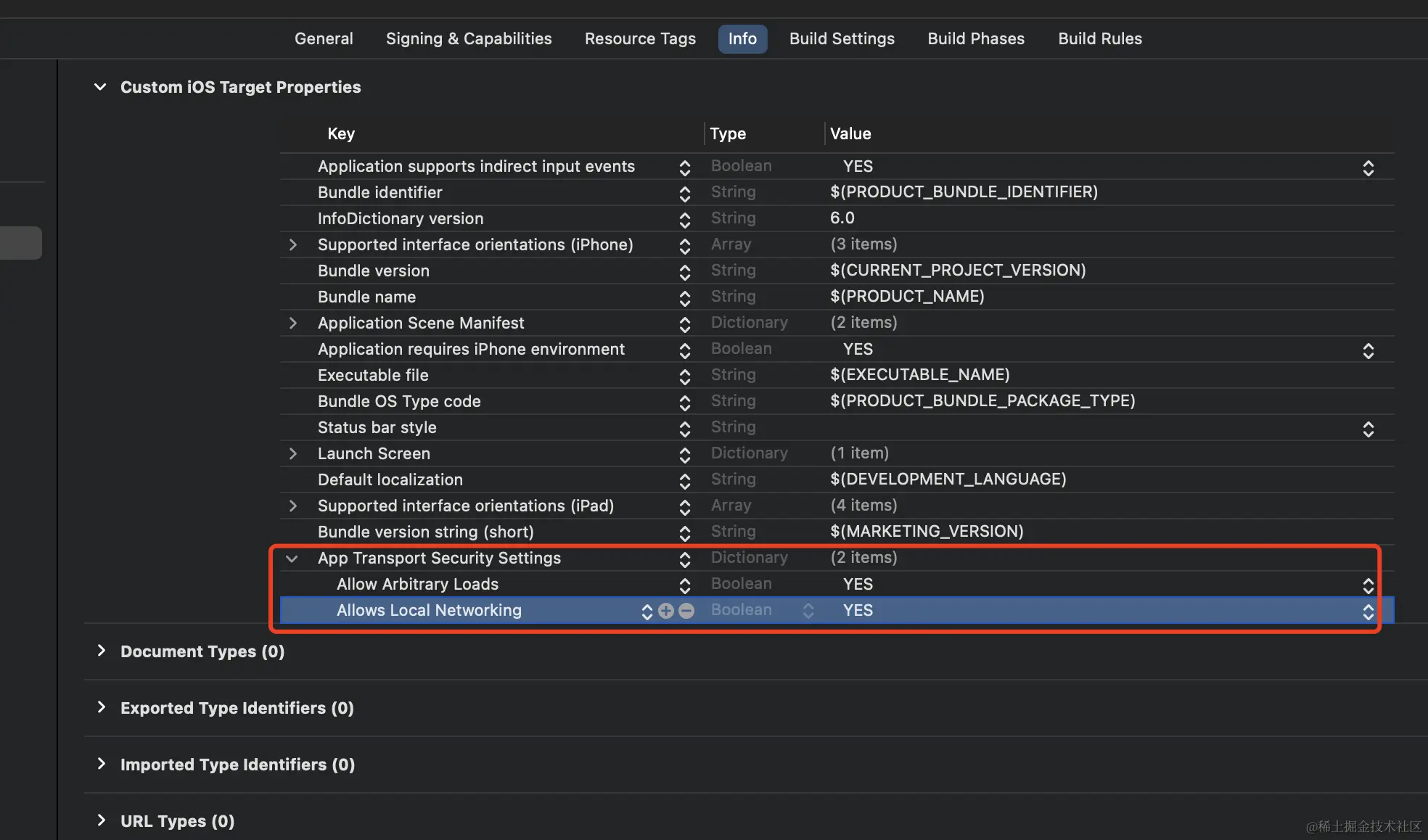 需要到项目的设置里面,点击info,如果没有App Transport Security Setting这一项,就点击最后一项,然后会有一个 + 号,点击加号,选择App Transport Security Setting,再点击左侧的 > 号折叠图标,添加 Allow Arbitary Loads的选项(Boolean类型)将其值改为YES即可