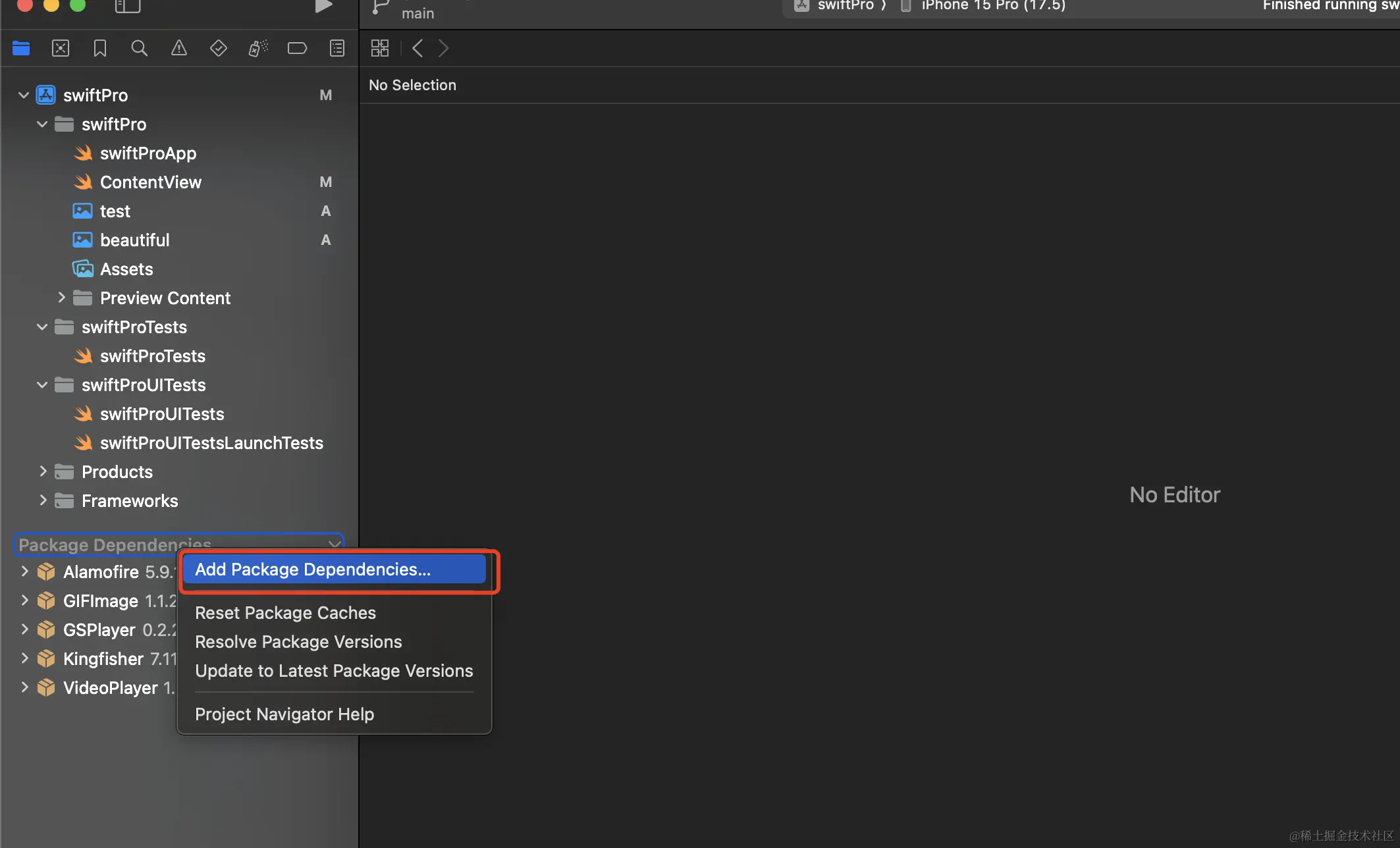 使用spm安装包,直接在xcode项目的依赖包右键,添加包: