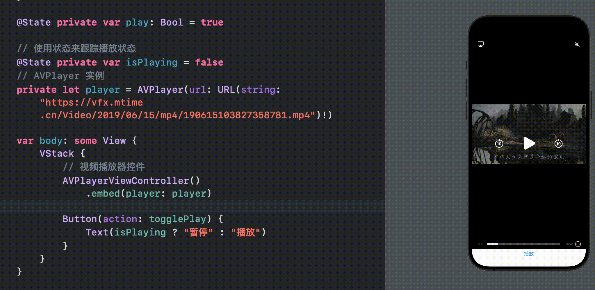 private let player = AVPlayer(url: URL(string: "https://vfx.mtime.cn/Video/2019/06/15/mp4/190615103827358781.mp4")!)
