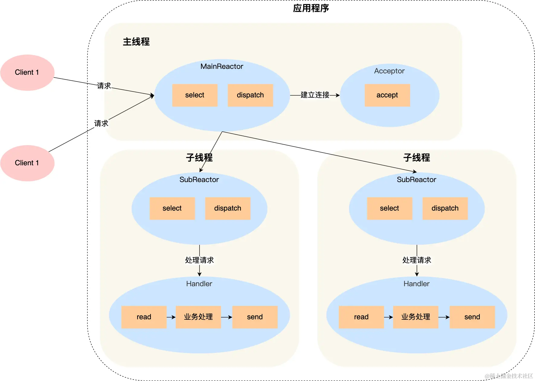 - Acceptor(接收器):用于处理 IO 连接请求。当 Reactor 检测到有新的客户端连接请求时,会通知 Acceptor,后者通过 accept() 方法接受连接请求,并创建一个新的 SocketChannel(在 Netty 中是 Channel)来表示这个连接。随后,Acceptor 通常会将这个新连接的 Channel 注册到 Worker Reactor 或 EventLoop 中,以便进一步处理该连接上的读写事件。