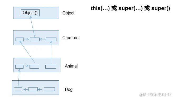 - 当我们通过子类的构造器创建子类对象时,我们一定会直接或间接的调用其父类的构造器,进而调用父类的父类的构造器,...直到调用了java.lang.Object类中空参的构造器为止。正因为加载过所的父类的结构,所以才可以看到内存中父类中的结构,子类对象才可以考虑进行调用。