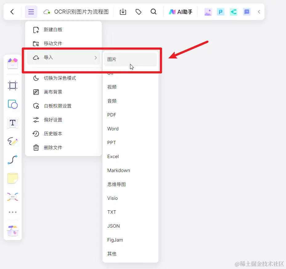 在任意一个boardmix文件中,点击左上角的「设置」按钮,选择「导入 > 图片」,将本地的图片上传到boardmix白板。