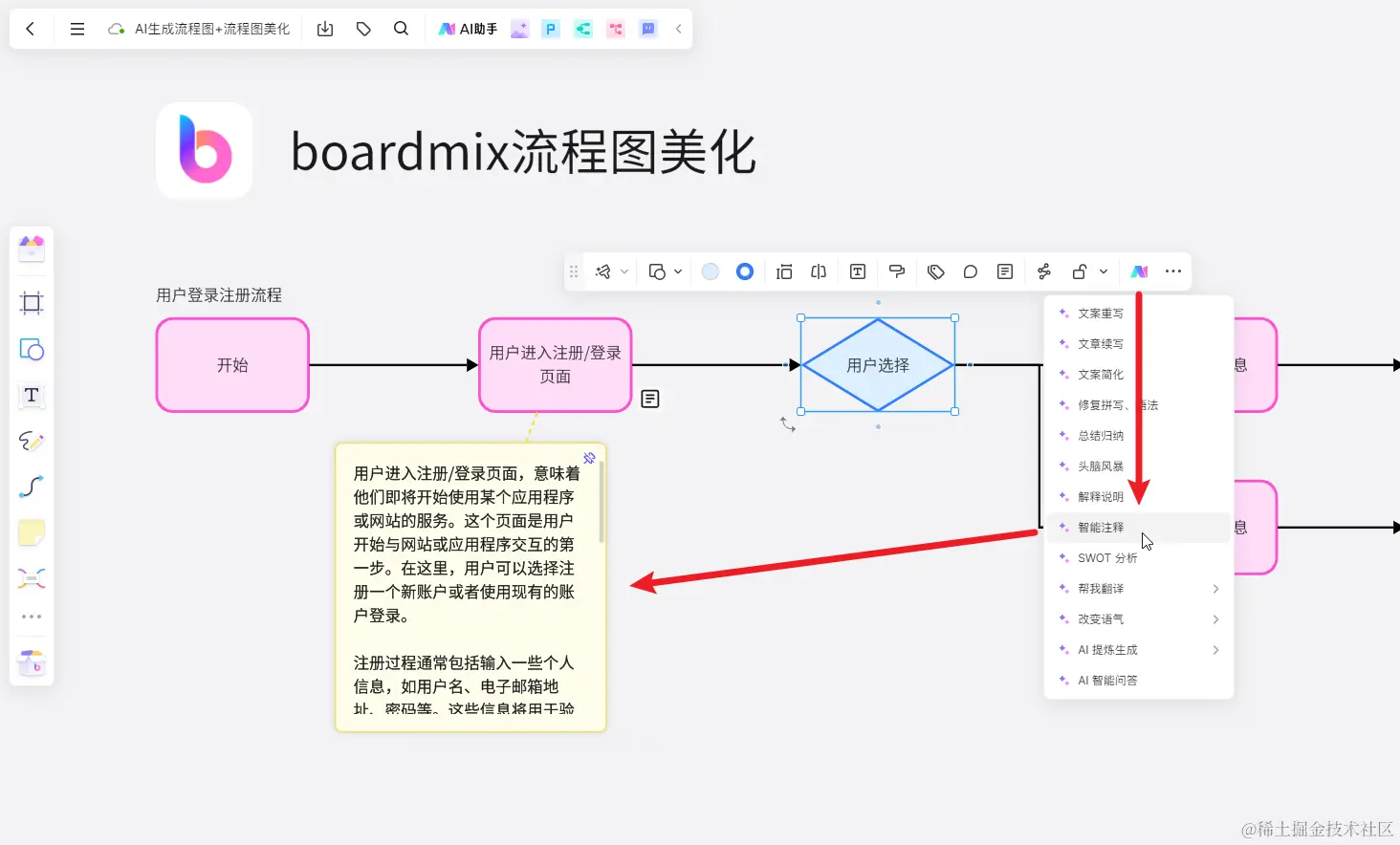 使用boardmix AI生成流程图后,我们可以继续使用AI,让AI极尽所能解答我们的问题。譬如我们不了解整个流程的某个环节,这时就可以选中对应的流程图节点,点击工具栏末尾的「AI助手」,在下方弹出的浮窗选择「智能注释」,boardmix会在节点旁边自动添加注释,为我们讲清当前环节的含义。