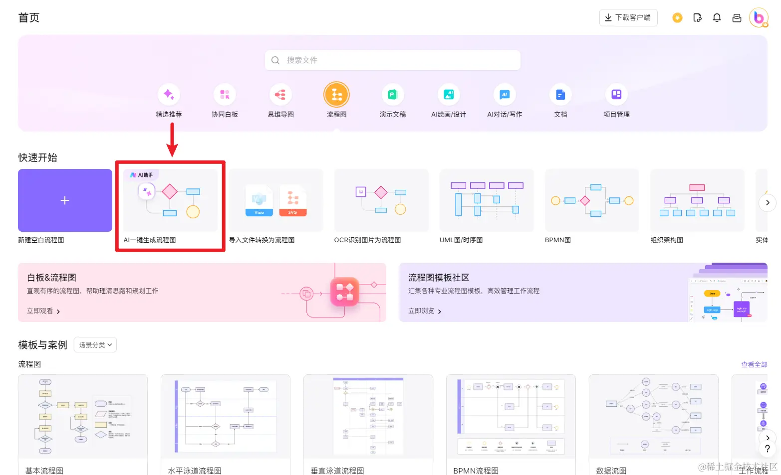 在浏览器打开boardmix AI首页,如下图所示,点击「AI一键生成流程图」,新建一个boardmix流程图文件。