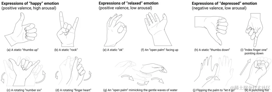 单手手势的表达潜力:一种情绪可以通过不同的手指方向、手掌方向、动作和力量来表达不同的方式。