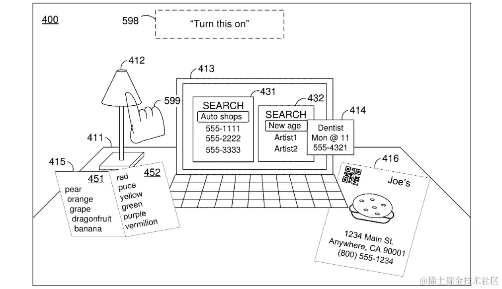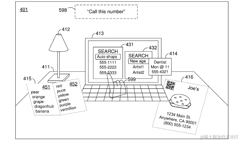 苹果也在其专利 US20230409122A1 《基于手势控制的智能设备操作技术》中描述了一项技术,允许用户通过特定的手势和语音命令与智能设备进行交互。例如,当用户指向一个电话号码并说出「呼叫这个号码」,如下图,系统会识别手势指向的对象和语音命令,然后自动拨打电话。也可以控制台灯的开关,或者调节亮度。