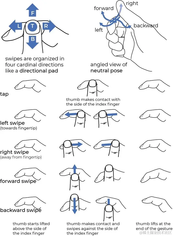 STMG 微手势集由针对食指桡侧执行的拇指动作组成。它们包括拇指点击和向左、向右、向前和向后四个方向的滑动。