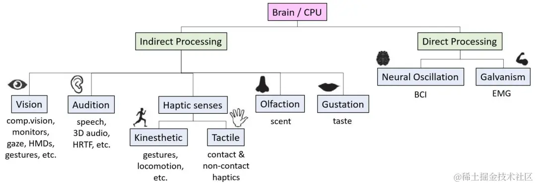 Ismo Rakkolainen 等人曾系统的总结了针对基于 XR 设备的多模态交互技术,并对基于人类感官的模态接口进行了分类。