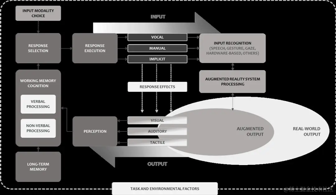 所以多模态交互的复杂度非常高。为了方便系统性的研究,韩国 CX Insight Team 的研究人员提出了一个在 AR 环境中的多模态交互框架,该框架考虑了人类信息处理的各个阶段,以及输入和输出模态如何协同工作。研究还强调了组合不同的交互模态可能对任务效率和用户性能产生的影响,并讨论了如何在 AR 系统设计中实施这些理论。
