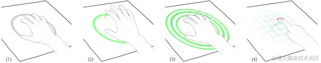 (1)所有手指都停留在目标表面上:在拇指、中指和小指定义的平面上出现一个灰色圆圈。(2-3) 通过整只手进行快速点击,创建触摸平面。(4) 表面现在可以用于触摸输入。
