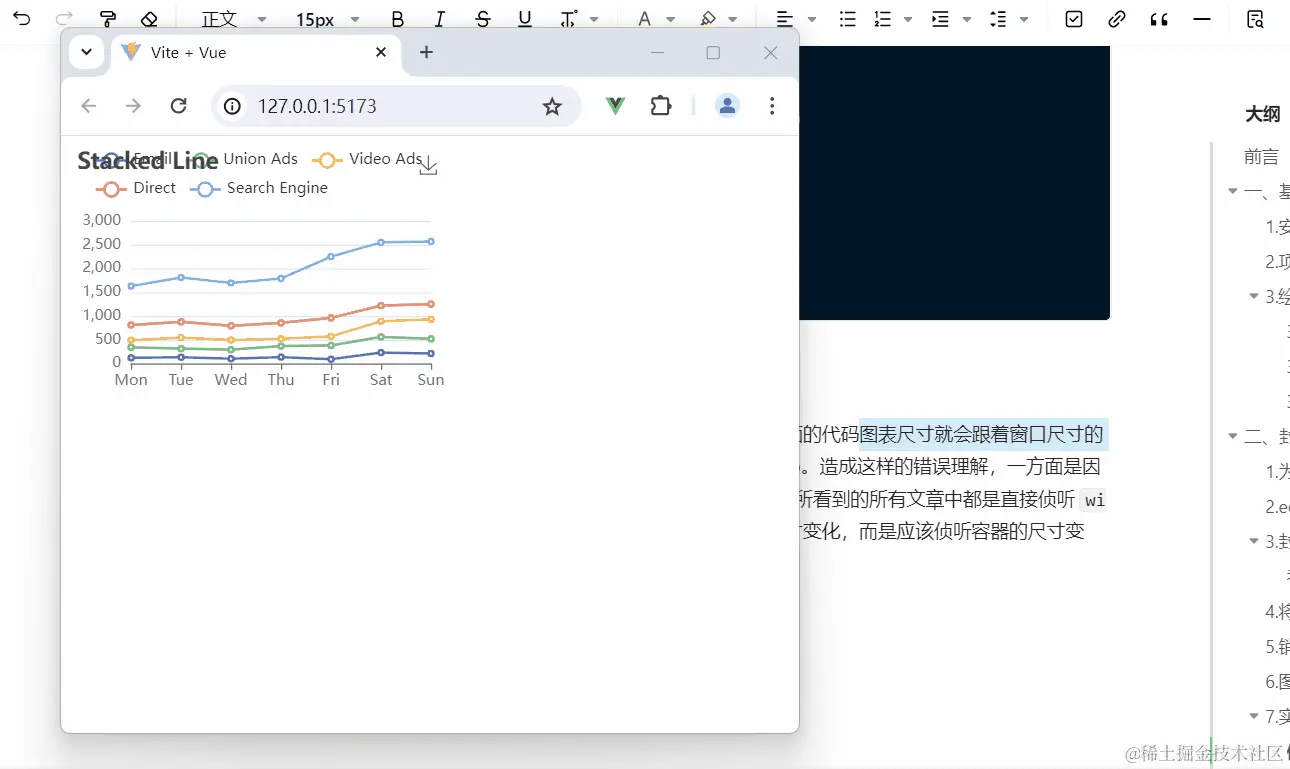 而在我之前的代码中将容器的尺寸设置为固定值,因此无论窗口的尺寸怎么变化,容器的尺寸都不会变,进而图表的尺寸也不会变。因此想要实现图表自适应,除了echarts组件中的相关代码外,还需要项目本身有自适应的方案(例如,基于rem或者scale的方案)。