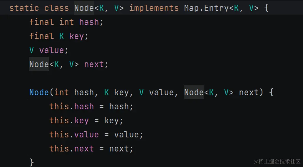 - next : 这里为什么要有一个next?应为会出现哈希值相同,但是内容不同的数据,当出现这样情况的时候,就需要将哈希值相同的Node组成一个链表,存储到数组table的空间中(也就是数组的节点中存储链表)。