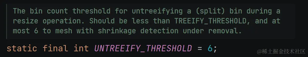 - UNTREEIFY_THRESHOLD: 当树的容量小于6的时候就会转化为链表