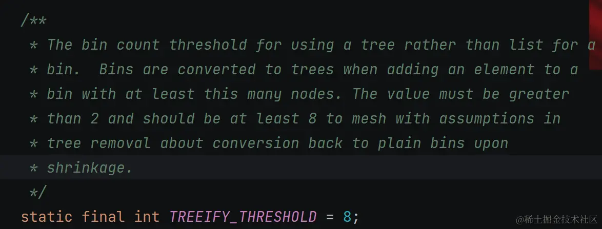 - TREEIFY_THRESHOLD: 链表转化为树的阈值,当链表中容量达到8的时候,就会转化为红黑树
