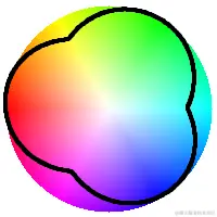 后来,当我对色彩理论了解更多时,我发现我所做的基本上是使颜色的色相围绕色轮上的圆圈移动。如果你在常见的颜色选择器中绘制我所做的路径,你会发现它并不产生一个完美的圆圈,而是更像一个三叶草图案,如下所示: