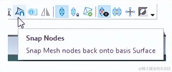如前所述,网格创建对话框现在支持四边形网格选项。网格工具栏已扩展为包含网格菜单中可用的所有命令。此外,捕捉节点到表面按钮的图标已更改: