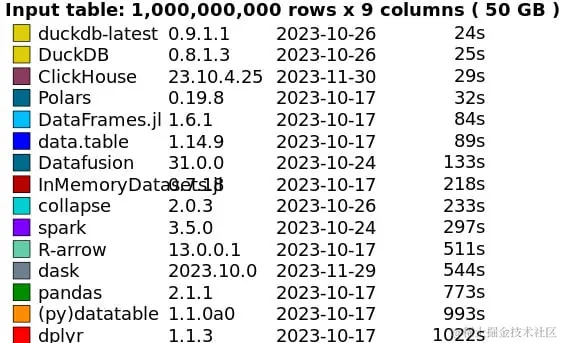这些数字令人印象深刻,2023 年,DuckDB 团队返回并 调整了配置设置并升级了硬件,并将 5GB 的工作负载减少到两秒,而 0.5GB 的工作负载减少到不到一秒。