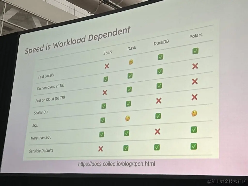Alex Monahan 在另一个 Pycon 演示中说:“一旦一个问题对 Pandas 来说有点太大了,你就必须向它抛出一个巨大的分布式系统。这就像用大锤子敲核桃。它不符合人体工程学。”Monham 是 MotherDuck 的前置软件工程师,该公司提供基于 Duck 的无服务器分析服务。