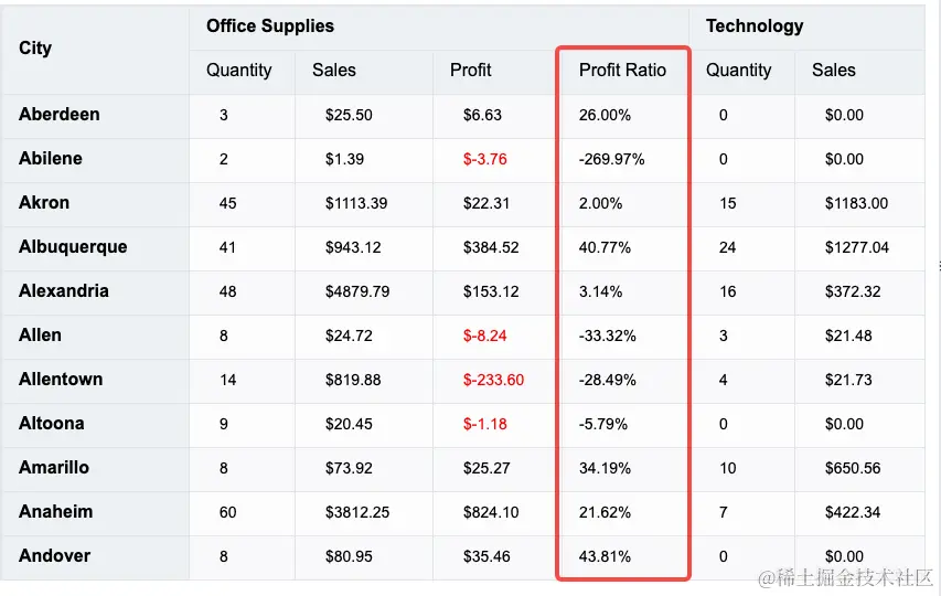 使用VTable官网的透视分析表为例进行类似目标的修改,我们在原有的demo中增加一个指标为Profit Ratio,显示的值用format函数进行计算,计算逻辑依赖于Sales和Profit两个指标的值。也就是我们计算了一个利润比,其中利润比 = 利润 / 销售额。
