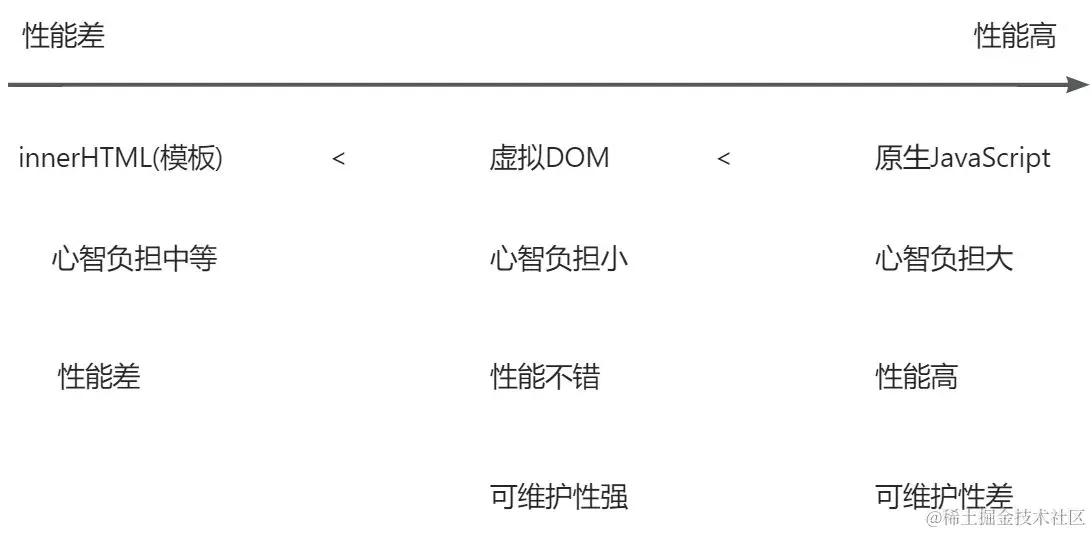 理论上讲采用虚拟DOM的更新技术的性能不可能比原生JavaScript操作DOM更高