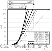 图5是FF600R17ME4,FF750R17ME7D和 FF900R17ME7在25度和150度结温的输出特性曲线。由于IGBT采用了微沟槽结构和载流子限制,它的的饱和压降得到了显著的降低,所以相同结温时,FF900R17ME7的曲线位于左侧,FF750R17ME4D位于中间,FF600R17ME4位于右侧。以FF600R17ME4的标称电流600A为基准对比这三种器件在150度结温的饱和压降,FF600R17ME4为2.45V。FF750R17ME7D为 1.81V,比FF600R17ME4低0.64V,大约 26.1%。FF900R17ME7为1.65V。FF900R17ME7为1.65V,比FF600R17ME4低 0.8V,大约32.6%。更公平的比较是基于器件各自的标称电流,此时FF750R17ME7D和 FF900R17ME7D的饱和压降均为为2.05V,比 FF600R17ME4低0.4V,大约16.3%。所以,IGBT7可以明显的降低IGBT的导通损耗。