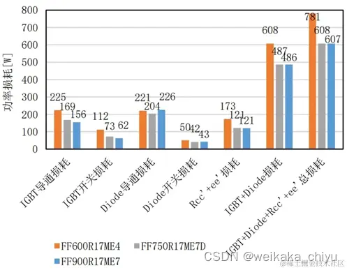图16.水冷SVG中FF600R17ME4,FF750R17ME7D和FF900R17ME7的损耗(一个IGBT和一个反并联二极管),输出电流500A