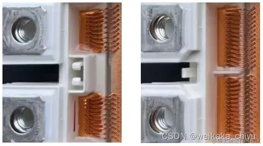 图8.EconoDUAL™3交直流功率端子与内部DCB连接图,FF600R17ME4(左),FF900R17ME7(右)