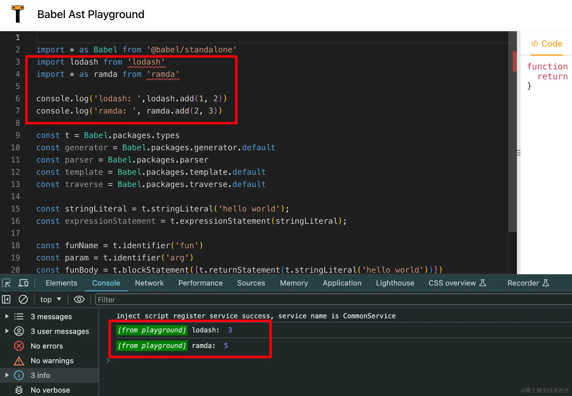 左侧是 monaco 编辑器,已经导入了 babel 相关的包,可以直接使用。