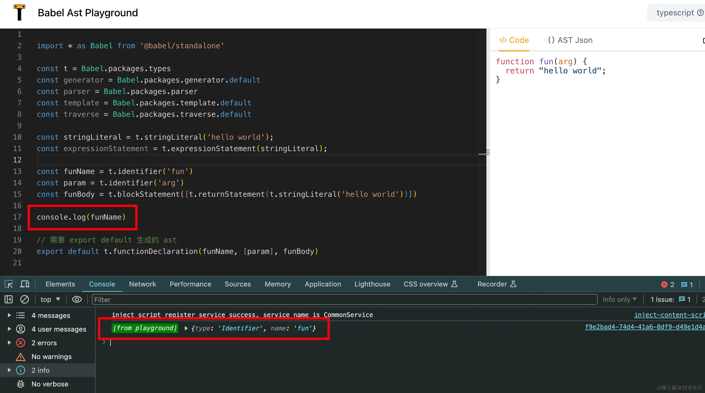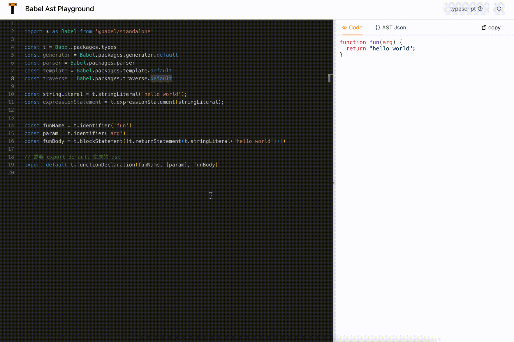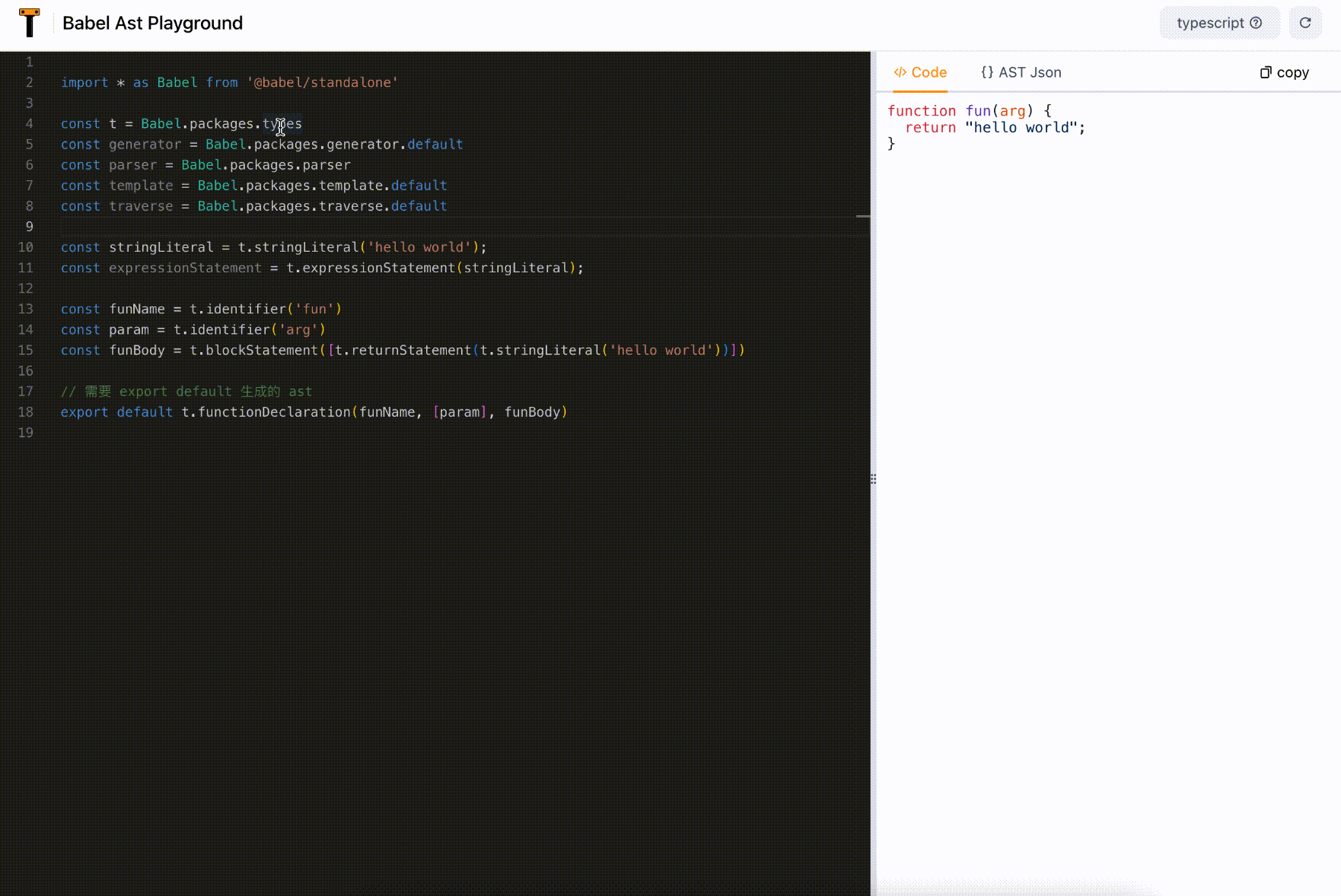 使用过的小伙伴应该知道@babel/typesAPI 非常多,AST 节点类型非常多,初学时不熟悉写起来很困难,需要看着包内的.d.ts文件一点一点写。而且还需要看到生成出的 AST 转成的代码是什么样才知道怎么调整。