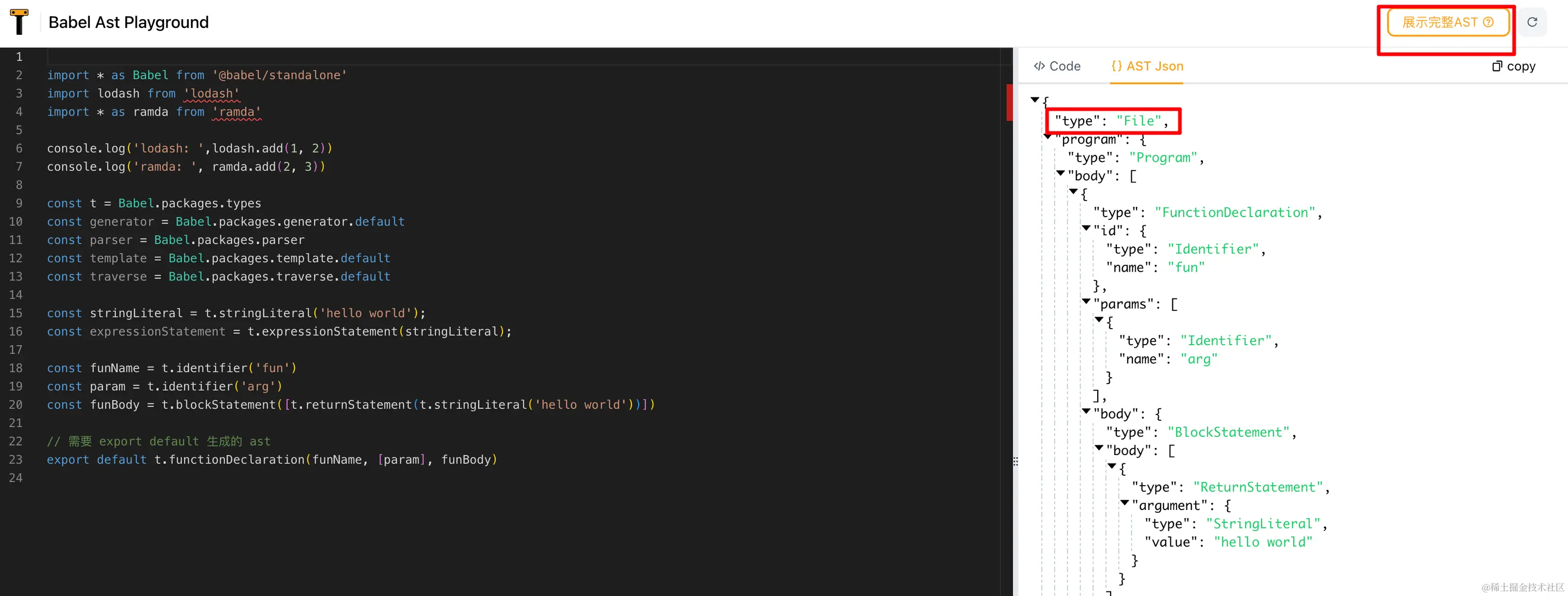 如果你想查看完整的 AST 结构,可以选中展示完整 AST,此时会展示全部 AST 节点,以 File 节点为根节点。