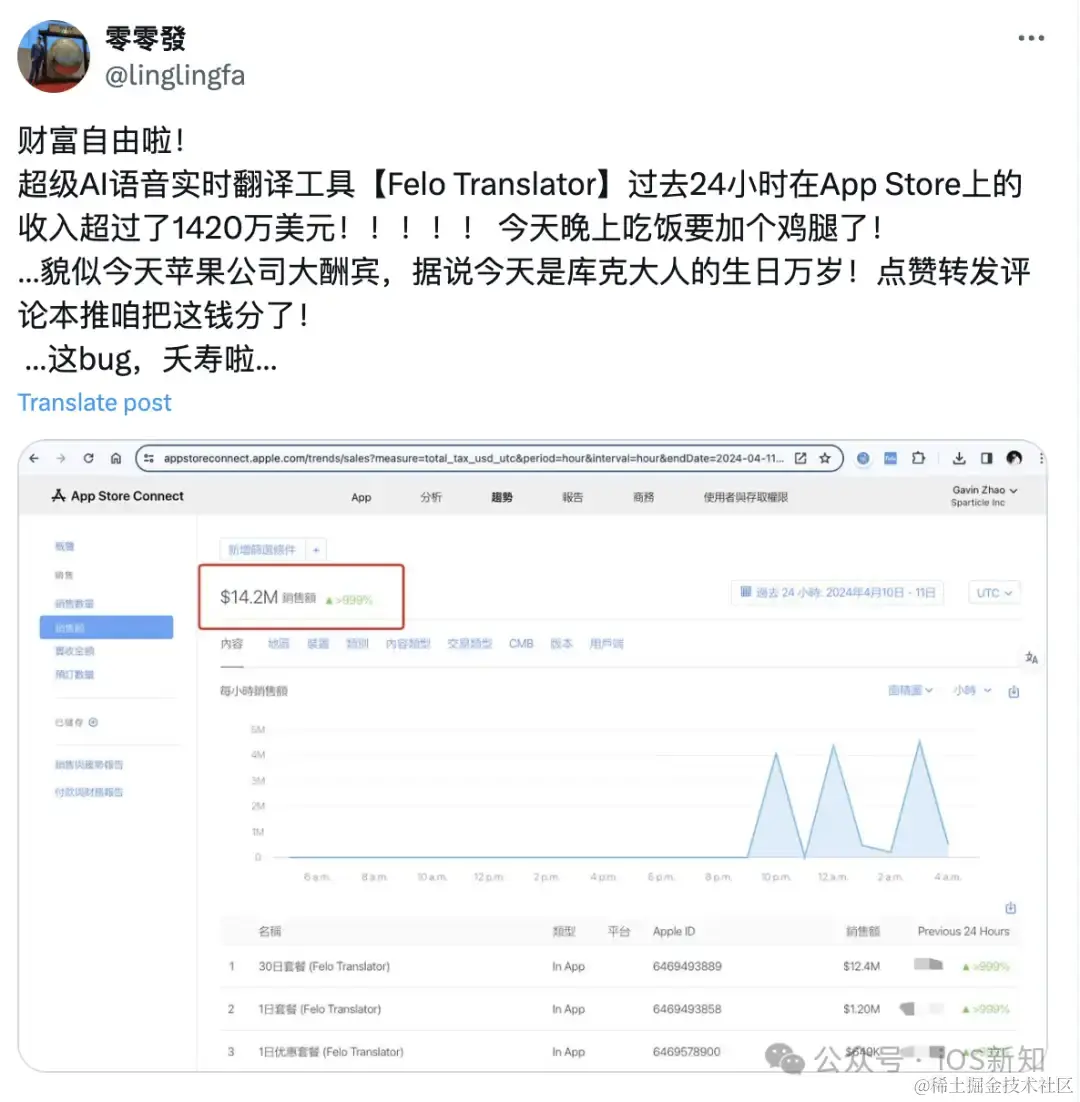 翻译工具 Felo Translator 的开发者晒截图,过去 24 小时收入超过了 1420 万美元。